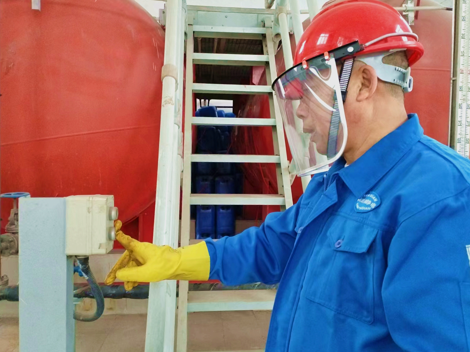 班前会后,老王拎起手电,带着青工小陈到生产现场查看设备情况。当他走进化水二楼储罐间,远远看到一排液碱储罐,罐身已被裹上厚厚的棉被,中间围了一圈电热毯。“班长,为什么给碱储罐加棉被呢?”小陈有点好奇,老王一边仔细观察墙上的温度表,一边解释:“液碱遇冷就会凝结,温度太低,影响再生效果。所以到严寒天气,液碱管道、储罐都要特别保护起来。”