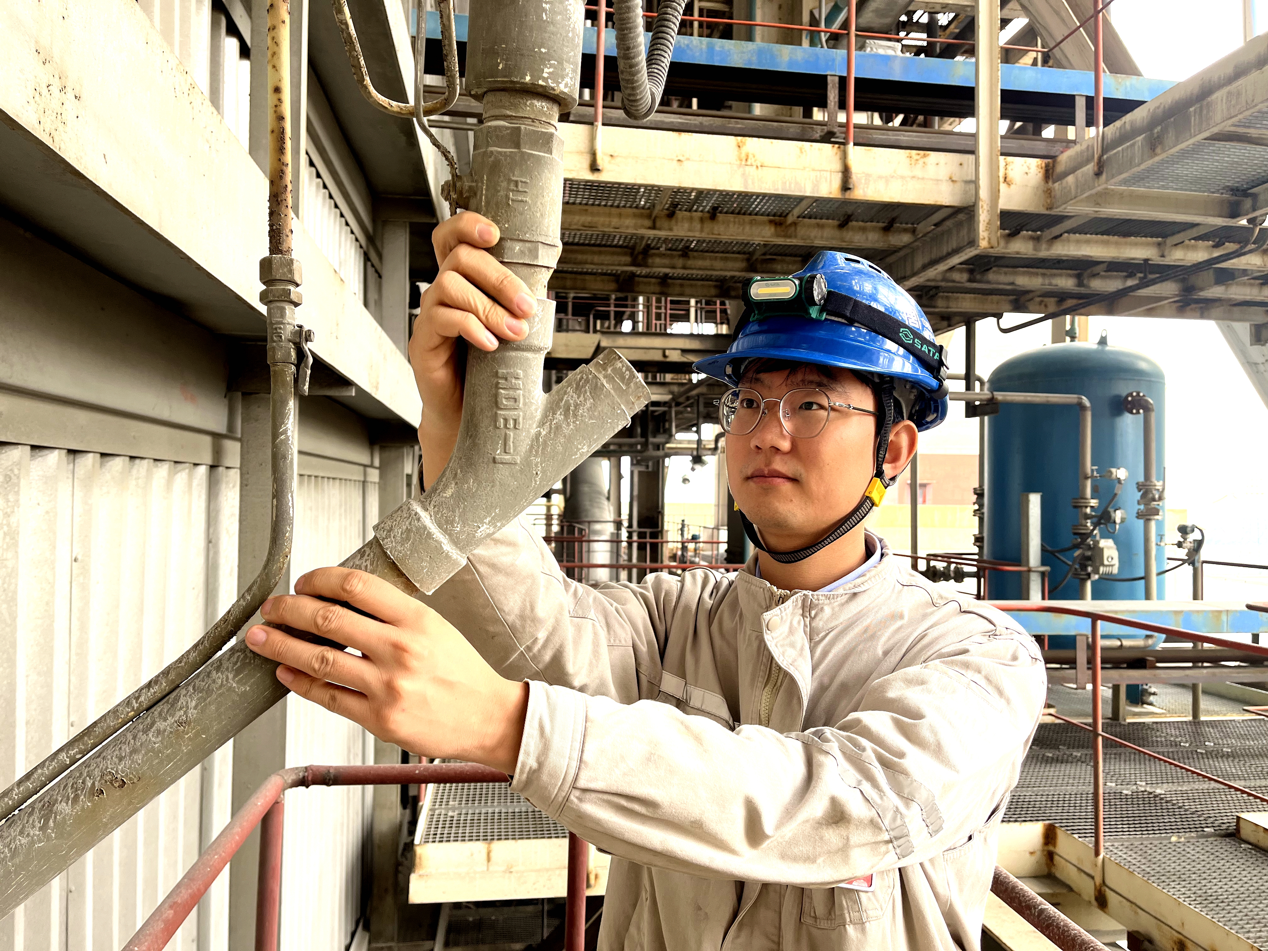 第一站是锅炉房8米平台。段科宇在轰鸣的设备间穿行,费了一番功夫,在一根粗大管道后面找到编号为7号的传感器。他需要检查它的外观是否完好,连接线缆有无老化,并记录运行参数。