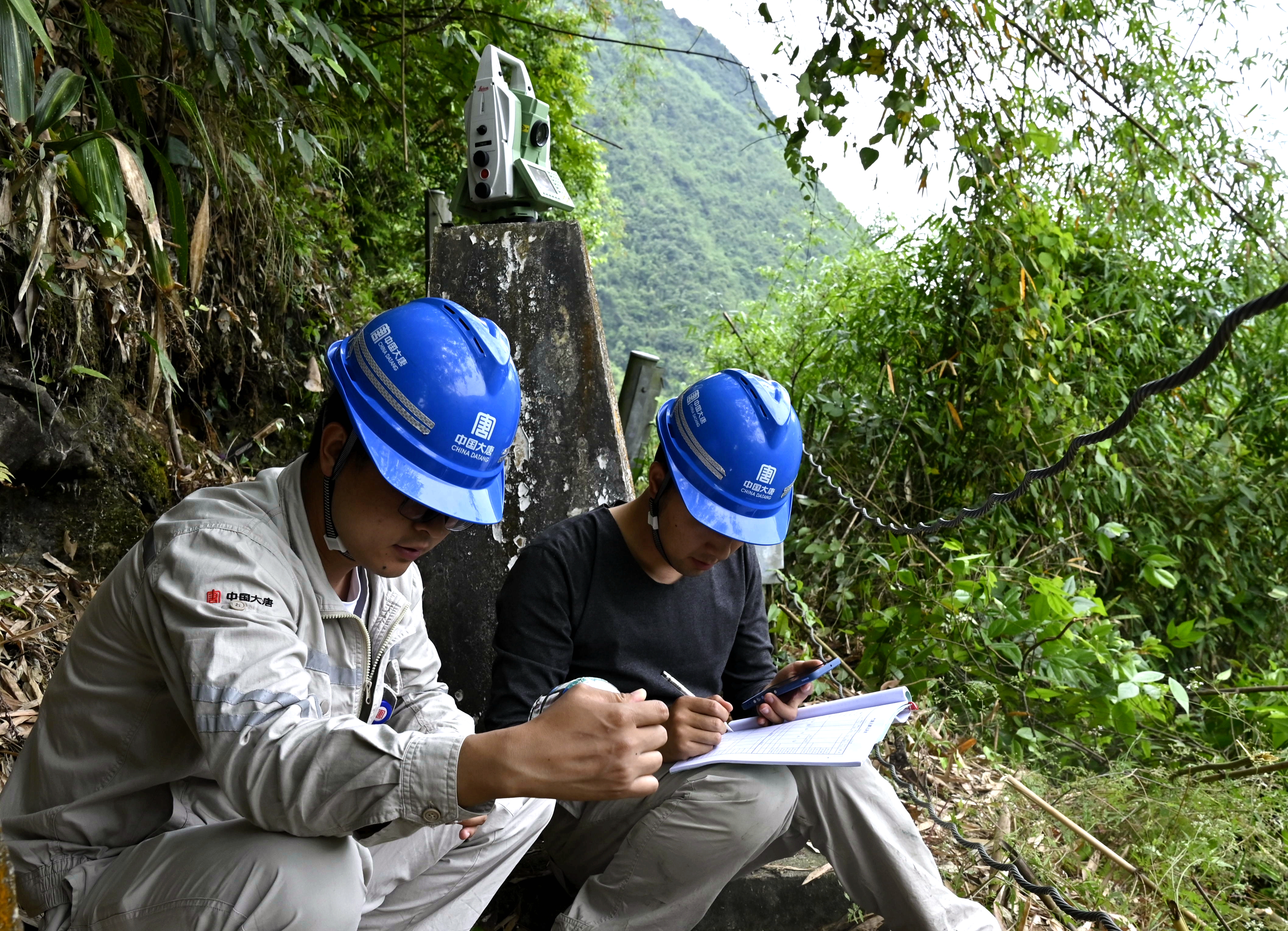 短暂的休息后,队伍继续向上。越往上,风势越大,不停拍打着脸颊,大家的额角也渗出细密的汗珠。终于,大家抵达此次测量的观测点——一个位于坝肩部位的狭小混凝土平台,面积仅能勉强容纳两三人站立,顾不上喘匀气息,也顾不上欣赏脚下平日里难以得见的壮阔库区景色,他们立刻投入了工作。