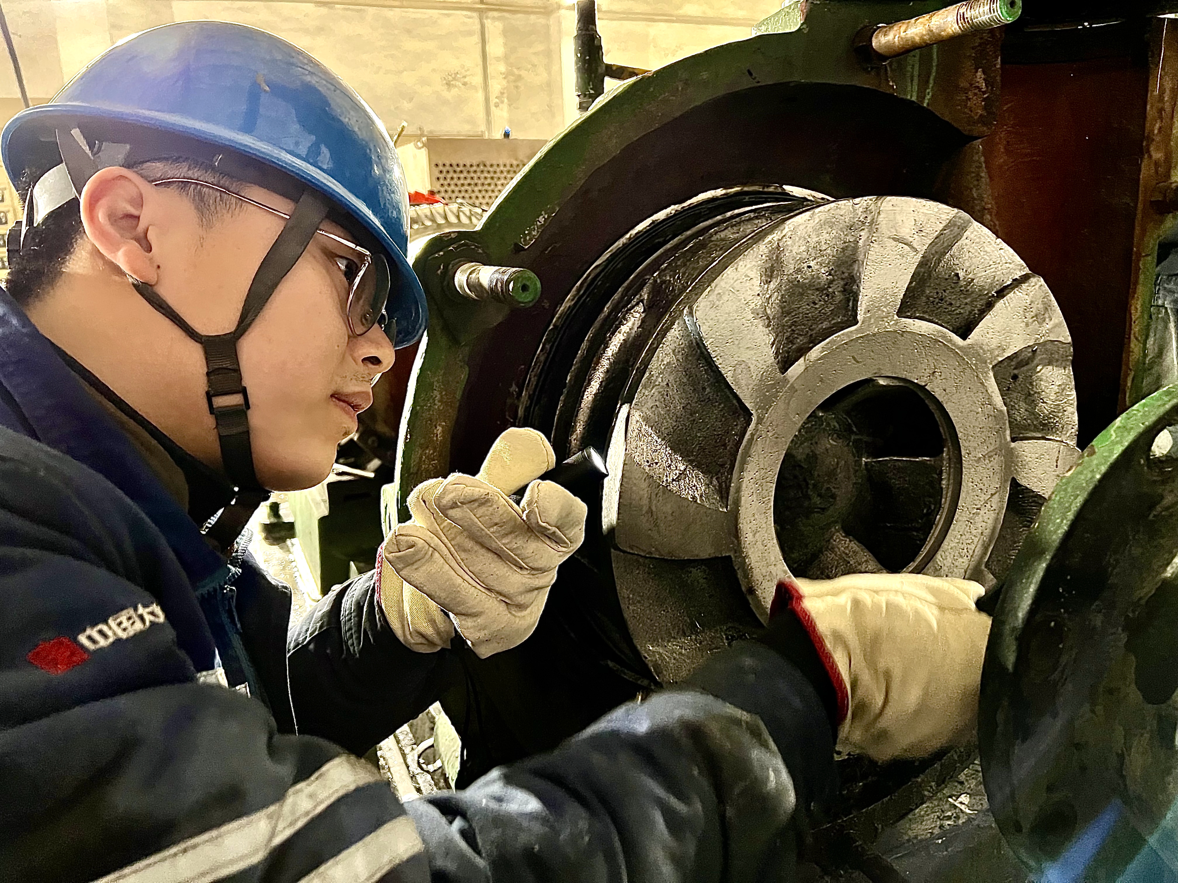 在行吊的配合下,泵轴、叶轮、泵盖顺利回装到位。李玮崑用手轻轻转动泵轴,观察机封压缩量是否合适。“小李,再压紧一点,感觉还有点松。”李金航屏住呼吸,缓慢调节固定螺钉,使机封达到最佳密封状态。