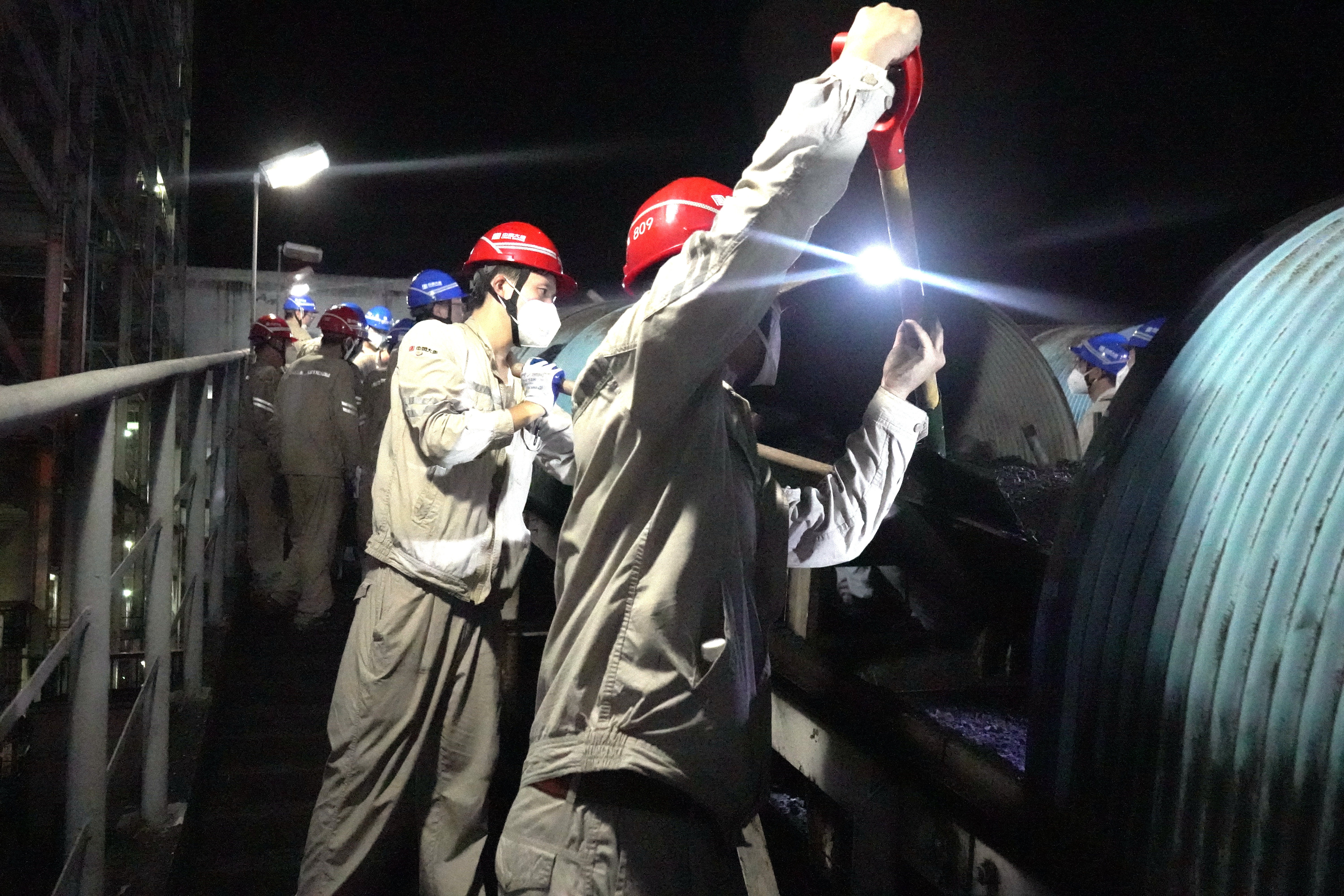 “注意与运行设备保持距离!大家压紧口罩鼻梁条,做好粉尘防护,随时观察脚下环境,防止绊倒。”安全监督组队员穿梭其间,紧盯细节,给这场“夜战”拉上一道安全防线。