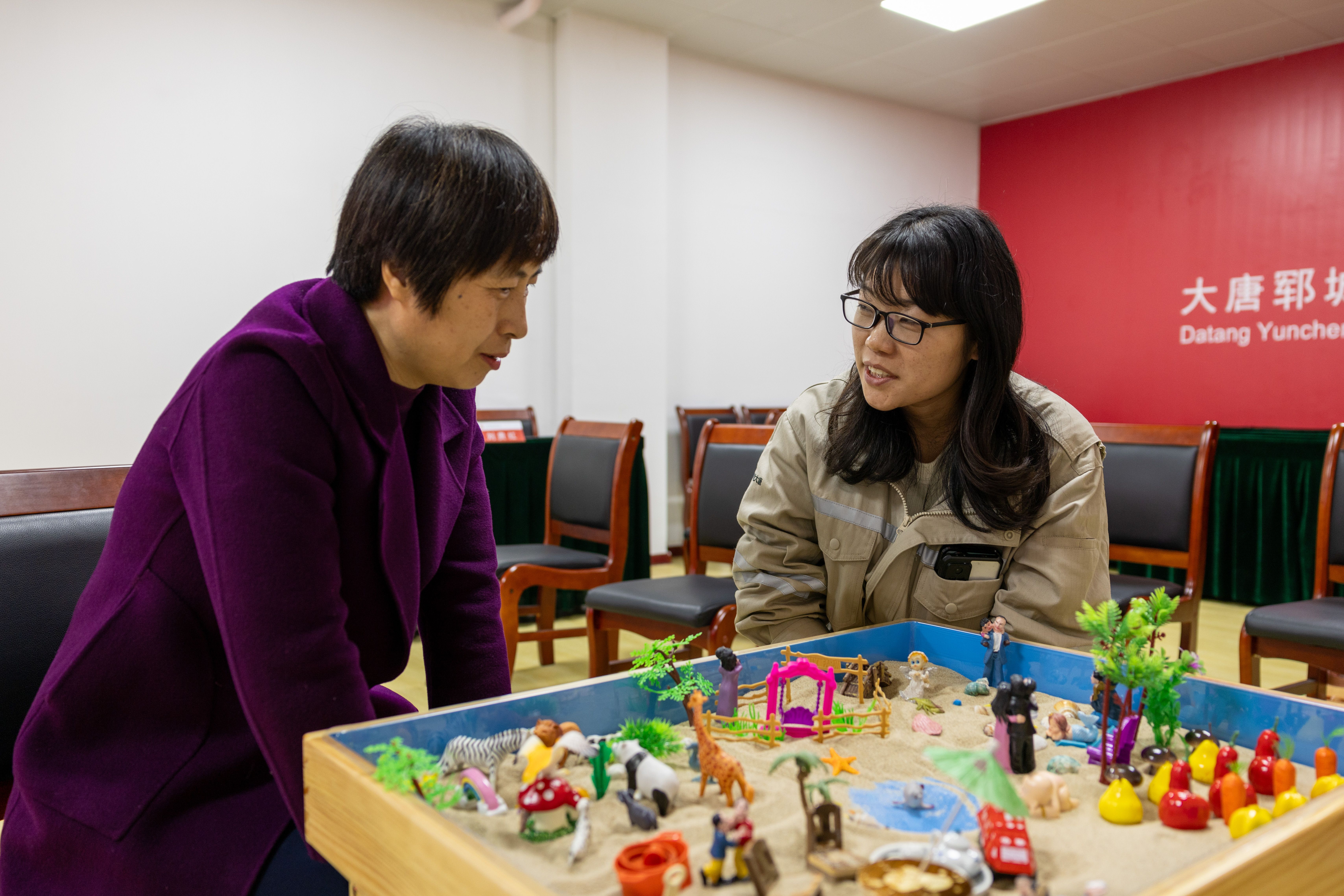 活动中,心理咨询师以一个个放松的小方法进行“破冰”,引导大家进行正念减压训练和冥想训练,让职工们沉浸在宁静之中。随后,职工们围坐在沙盘周围,详细了解沙盘游戏及活动规则,依次挑选心仪的沙具放置在沙盘中,分享各自作品背后的故事,并通过心理咨询师的解读,帮助广大职工纾解压力、打开心扉、发现自己,实现心灵上的交流与碰撞。