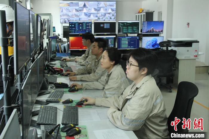 图为5日,大唐第十四师昆玉市100万千瓦光伏基地中控室内,工作人员通过智能化、数字化系统进行运维操作。马晓东 摄