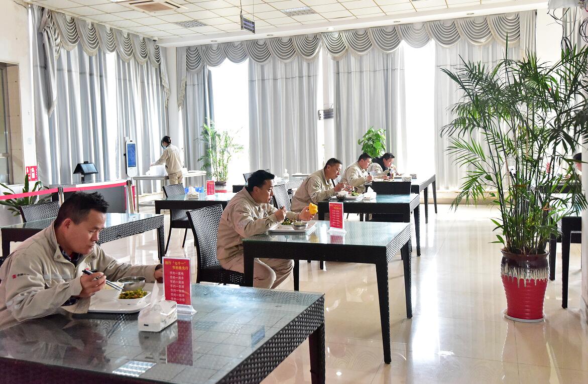 为保证公共场所卫生安全,该公司严格落实封闭场所戴口罩、测温、消毒等措施,职工食堂内分批分时就餐、同向就坐等以“独”攻毒防控措施,已然成为苏热人的行动准则。