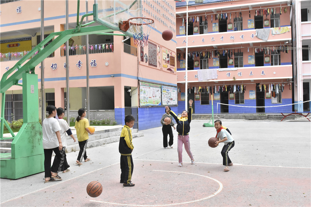 板兰村小学的孩子们正在球场欢快地投篮