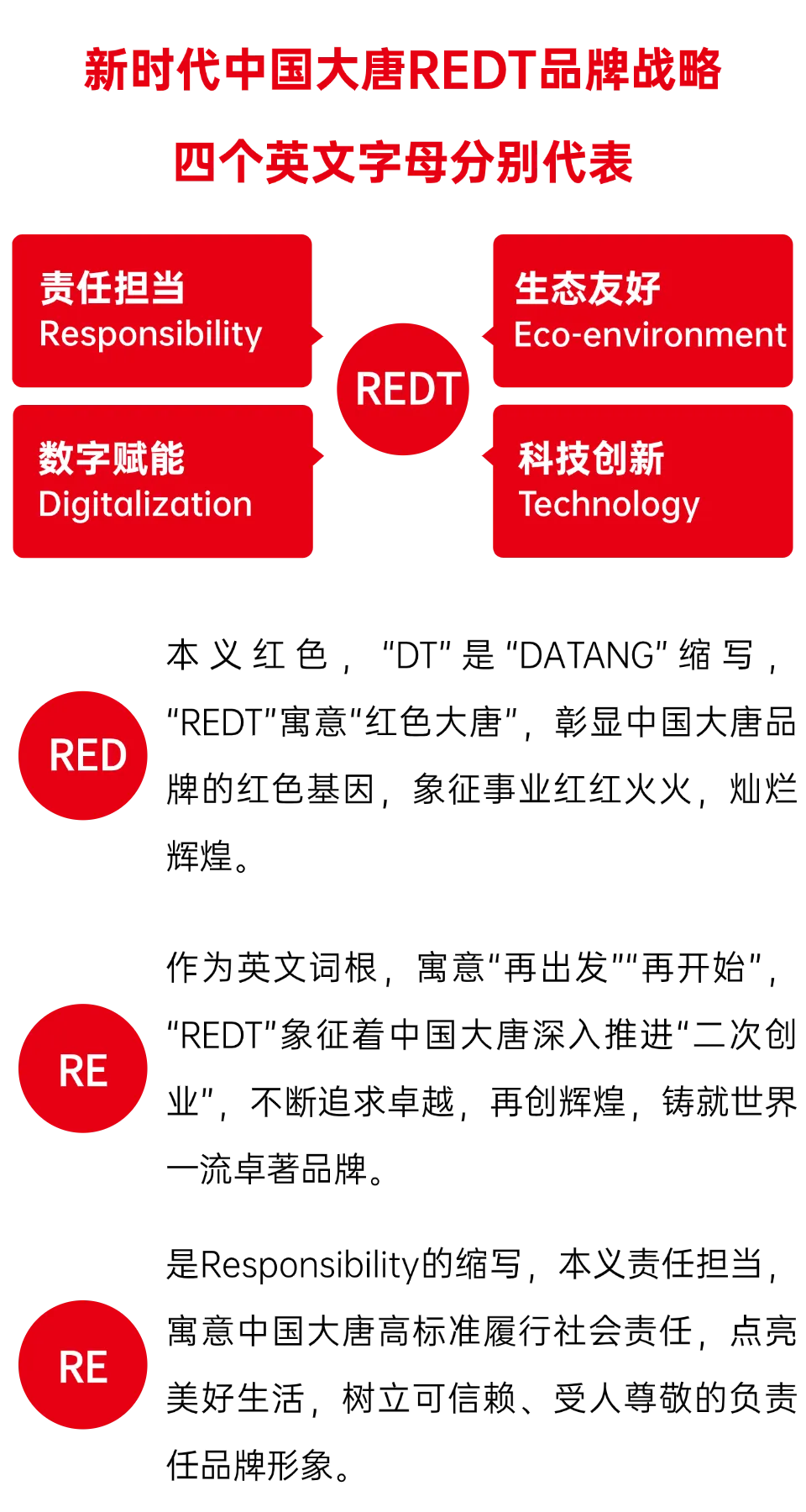 庄树新对best365官方网站REDT品牌战略的成功发布表示祝贺,对best365官方网站品牌建设成效表示肯定。庄树新指出,中央企业是国民经济的中坚骨干,是我国参与国际竞争合作的主力军。新时代新征程,中央企业必须坚决贯彻落实习近平总书记关于品牌工作重要论述,大力提升品牌价值,培育打造更多优秀品牌,增强核心功能、提升核心竞争力,加快建设世界一流企业。希望best365官方网站以此为契机,乘势而上、奋勇前行,在品牌战略引领中迈出新步伐,在全面品牌管理中展现新气象,在品牌价值提升中取得新成效,以品牌强企助建品牌强国,在促进“三个转变”中走在前、作表率。国务院国资委将进一步加强政策引导、考核激励、典型带动,更加全面、更加深入推进中央企业品牌创新发展。