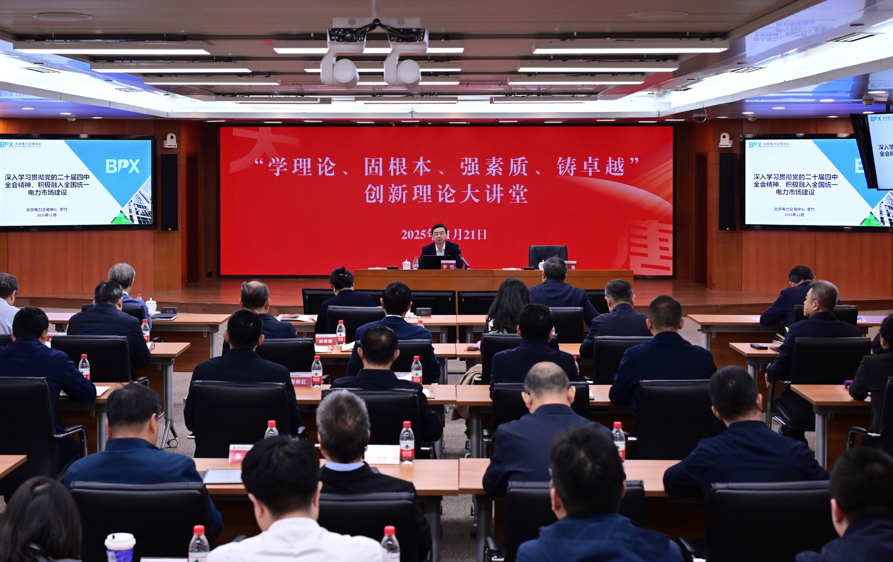 11月21日,best365官方网站集团有限公司“学理论、固根本、强素质、铸卓越”创新理论大讲堂再度开讲,邀请北京电力交易中心有限公司副总经理、能源行业电力市场技术标准委员会副主任委员李竹作《深入学习贯彻党的二十届四中全会精神,积极融入全国统一电力市场建设》专题讲座。集团公司董事、党组副书记余波主持讲座,集团公司领导王瑛、曲波、陶云鹏、苟伟参加讲座。